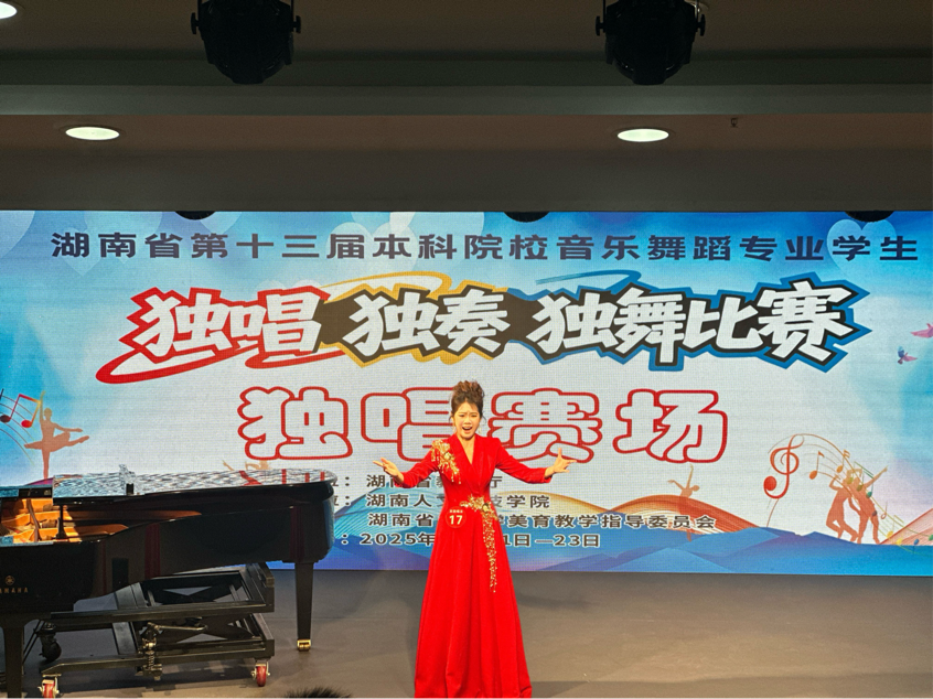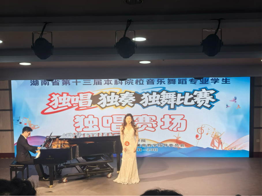 近日,由湖南省教育厅主办的湖南省第十三届本科院校音乐舞蹈专业学生独唱、独奏、独舞(“三独”)比赛在湖南人文科技学院举行。湖南科技大学壹号娱乐 音乐舞蹈专业的学子们在众多参赛选手中脱颖而出,斩获4个一等奖、6个二等奖、2个三等奖的优异成绩,壹号娱乐 彭斯特老师荣获优秀伴奏奖,师生携手奋进,尽显学院音乐舞蹈专业办学实力与育人成效。