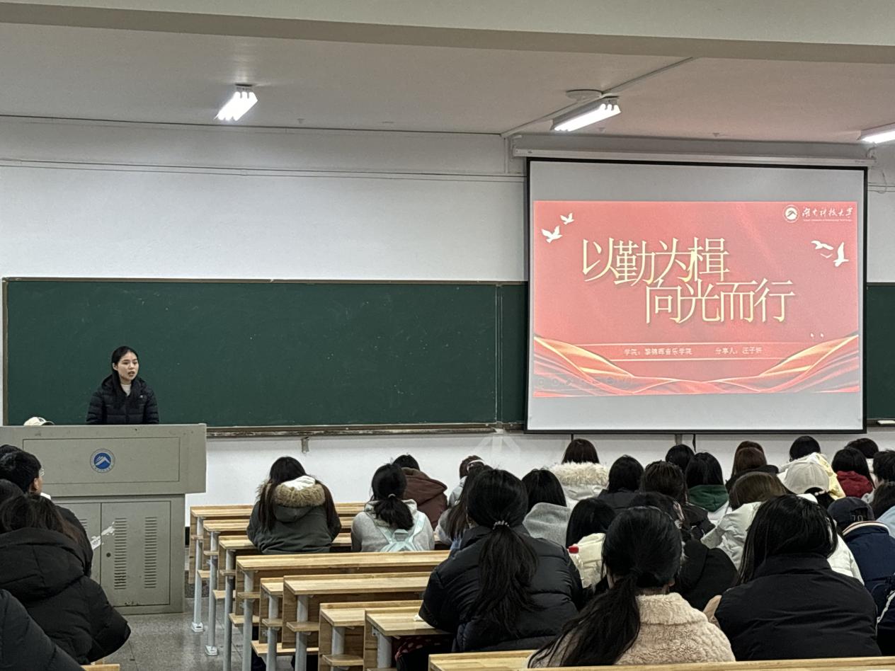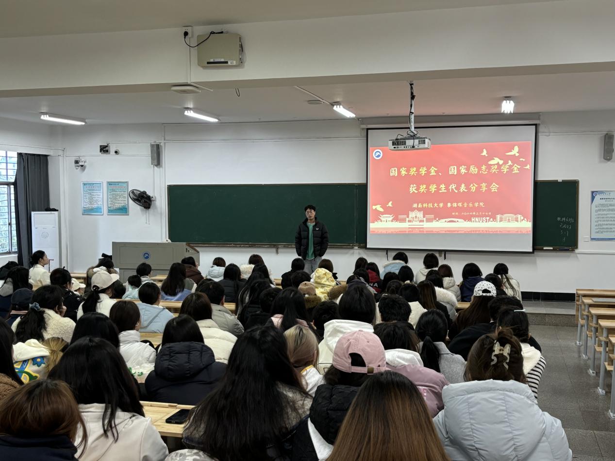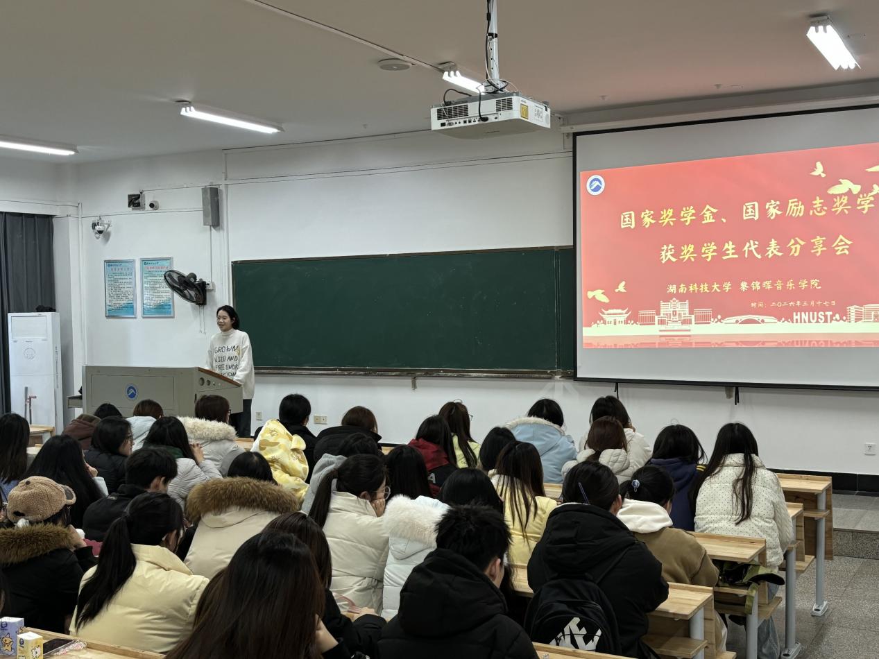 为发挥优秀学生榜样示范引领作用,营造优良学风,3月17日下午,音乐学院“2025年国家奖学金、国家励志奖学金获奖学生代表分享会”在第一教学楼102教室圆满举行。学院学工办彭雅婷、瞿亚两位老师出席,全体大一新生到场聆听,汲取榜样奋进力量。